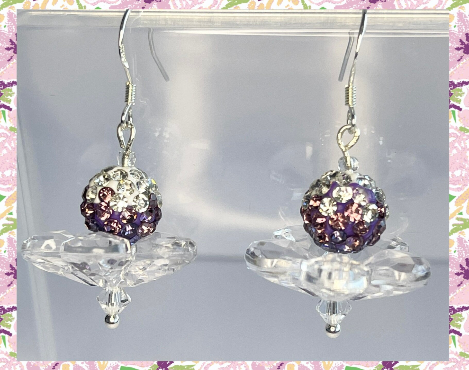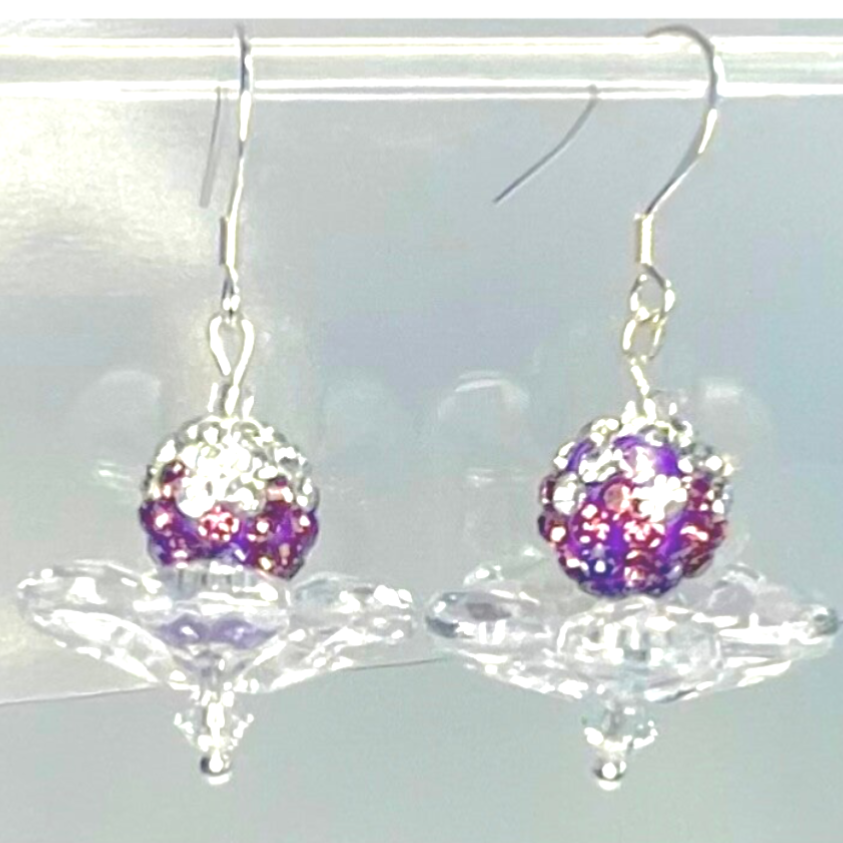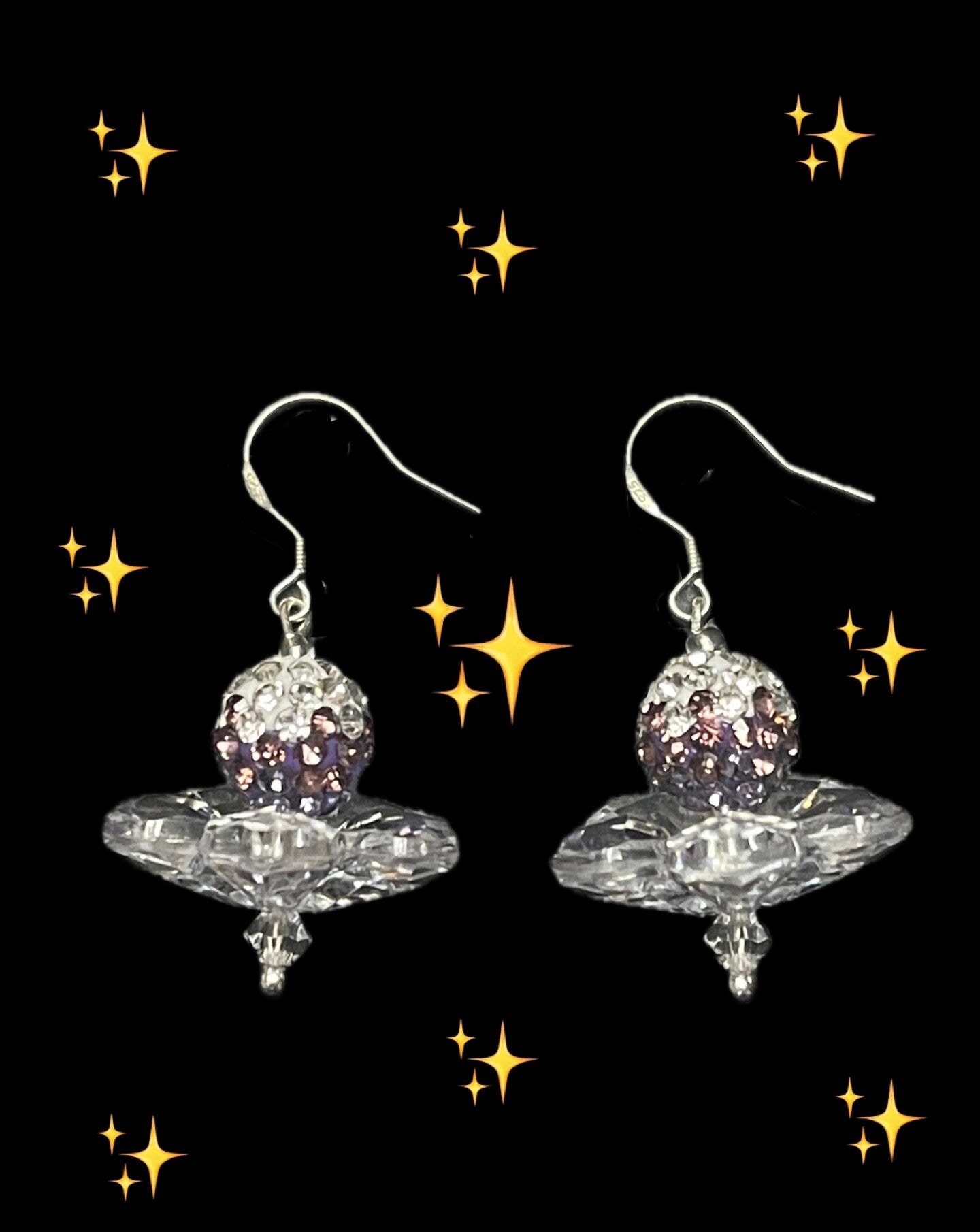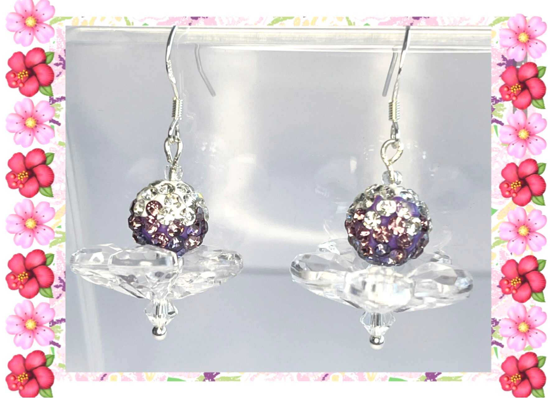 🌺🌸🦋 FLORISHING ROYAL LUXURIOUS PURPLE CHARCOAL ELEGANCE 🦋🌸🌺 Be the belle of the universe and Inspire you’re creativity and imagination with these exclusive earrings featuring a 10mm purple charcoal rhinestone studded glass and and acrylic bead accented by a glass crystal aurora borealis facedted rondelle 4mm bead set on top of a white acrylic flower pedal bead set on sterling silver findings. Each earring measuring 4cm long.