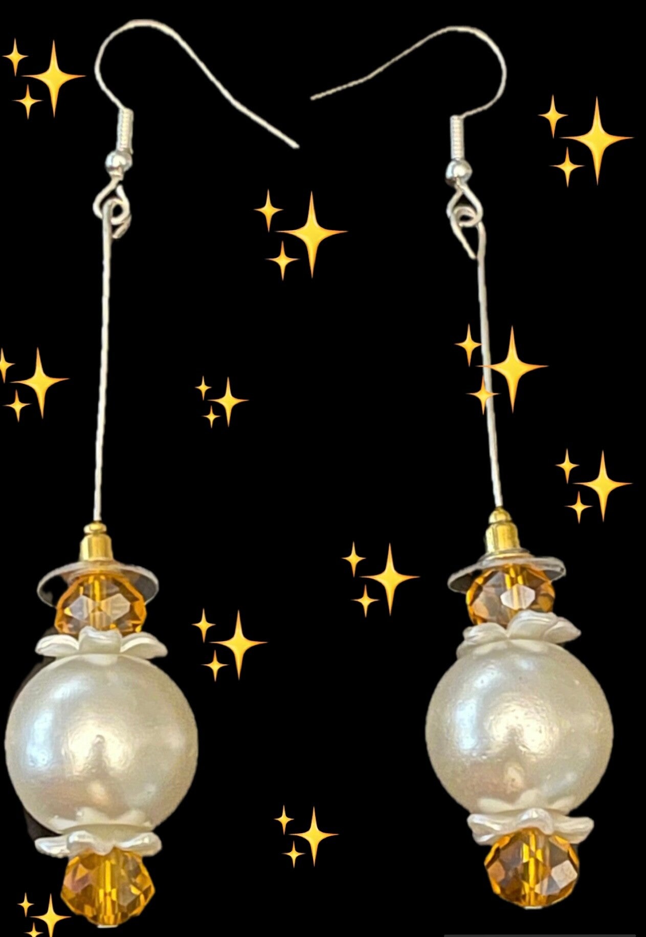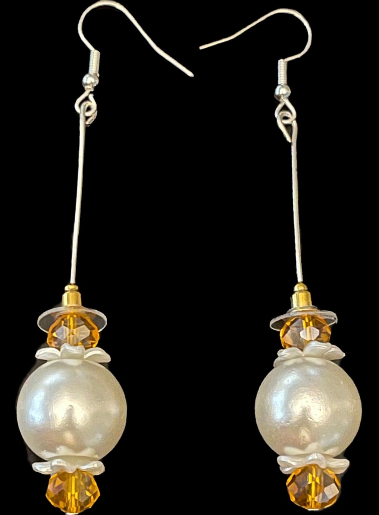 2 amber glass beads set ontop of white acrylic flower pedal beads give a beautiful accent to the 18mm fauceted pearl. Earrings measure 7cm long.