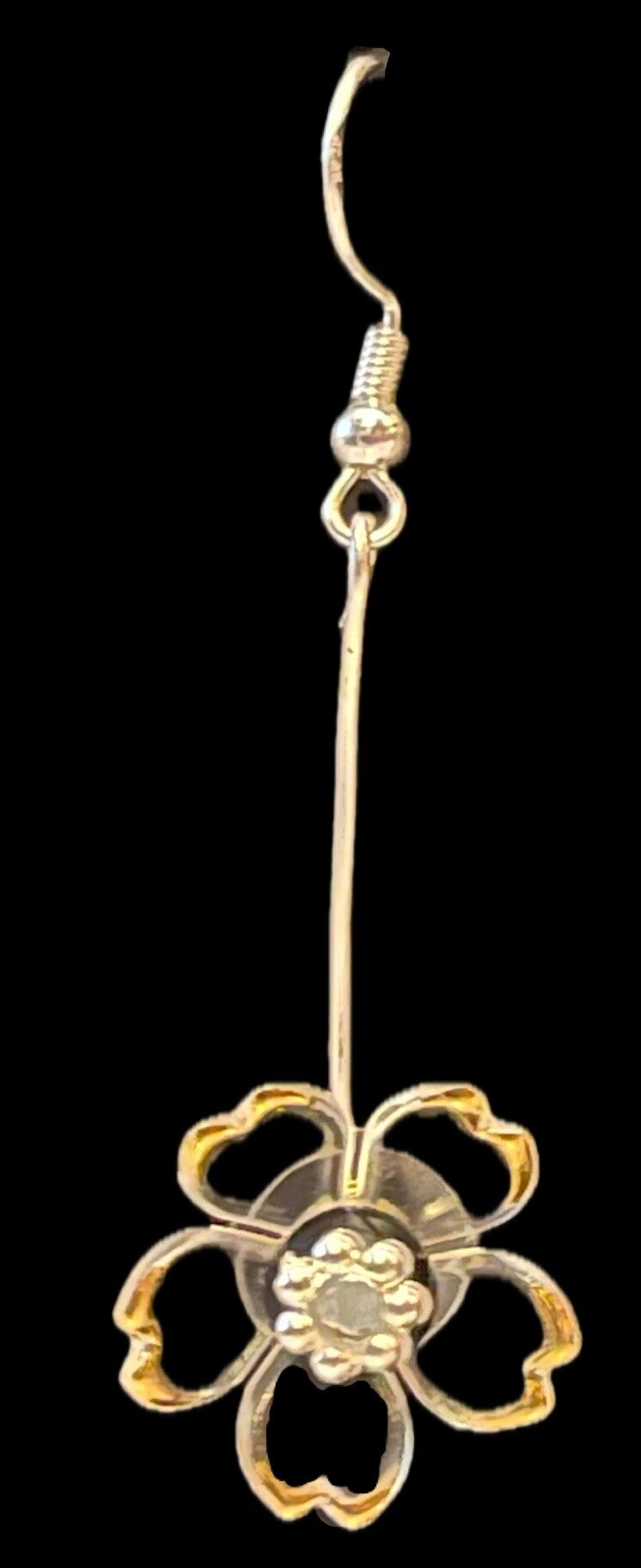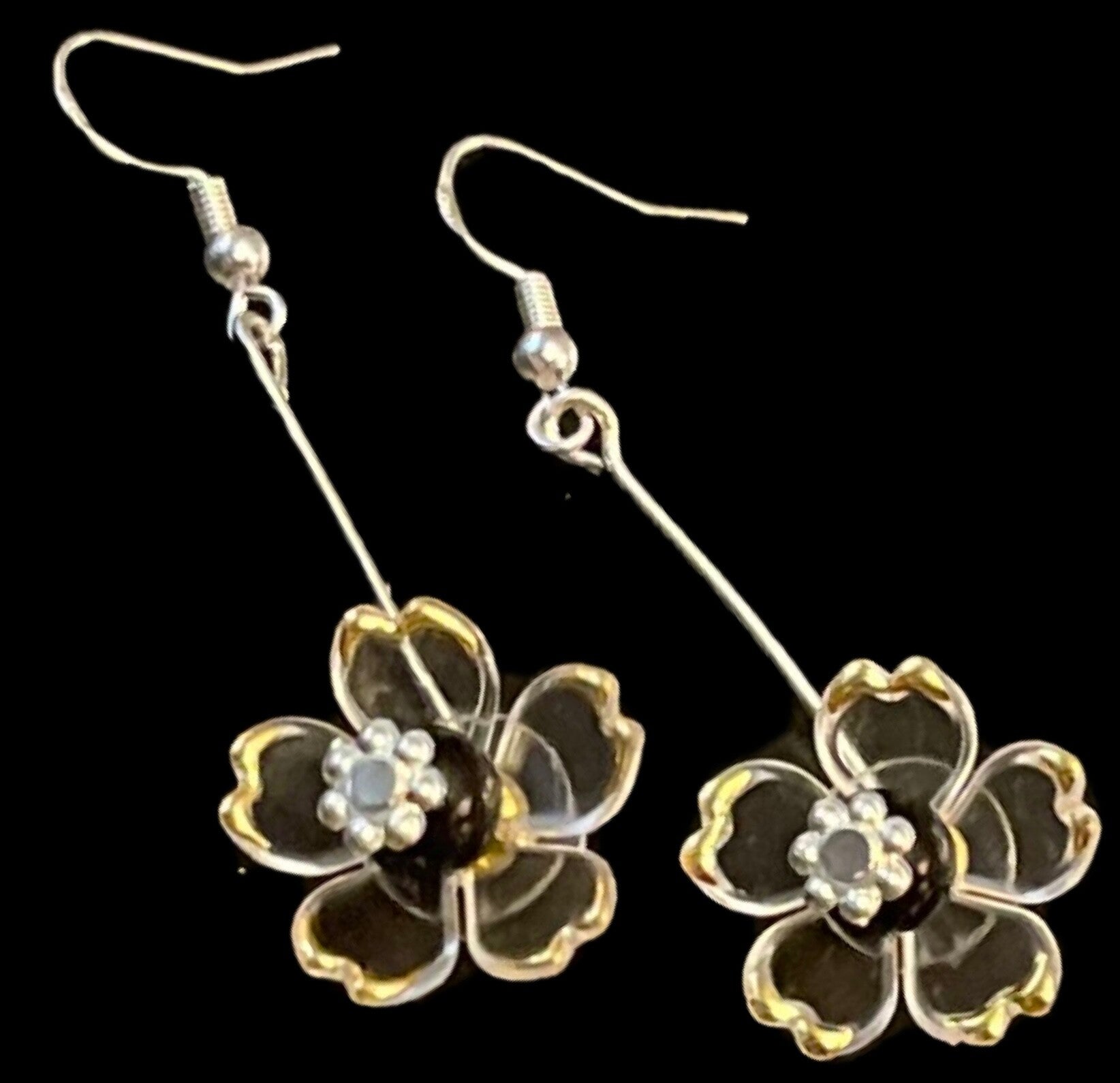Exuding power strength elegance and The Black Golden blooming flower made with 925 sterling silver hooks, head pin is nickel free, containing iron in silver tone colour, with a clear gold trim acrylic flower pedal with a beautiful 6mm fauceted black onyx colour crystal bead. Earring measures 5 cm long