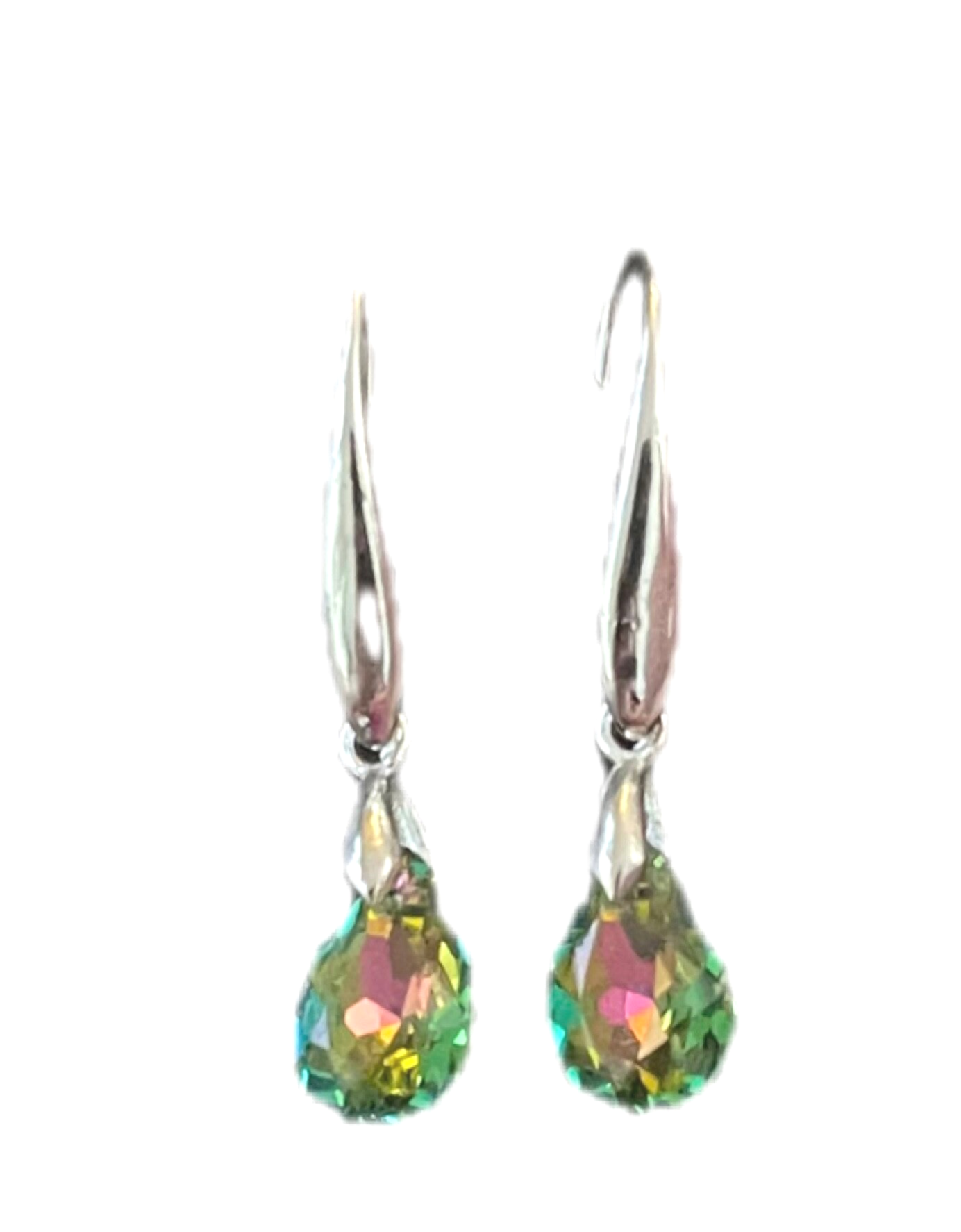 💚💝BRILLIANCE SILVER AURORA BOREALIS TEARDROPS 💚💝 The shape of the crystal is a single, teardrop-shaped earring with a reflective, iridescent finish. The faceted glass crystal with an aurora borealis (AB) coating known for its iridescent properties, meaning the colors shift and change depending on the angle of light and movement, creating a dynamic play of colors that can include other subtle tones beyond just green and pink . Findings composed of 925 sterling silver lever back hooks. Earrings measure 4cm long