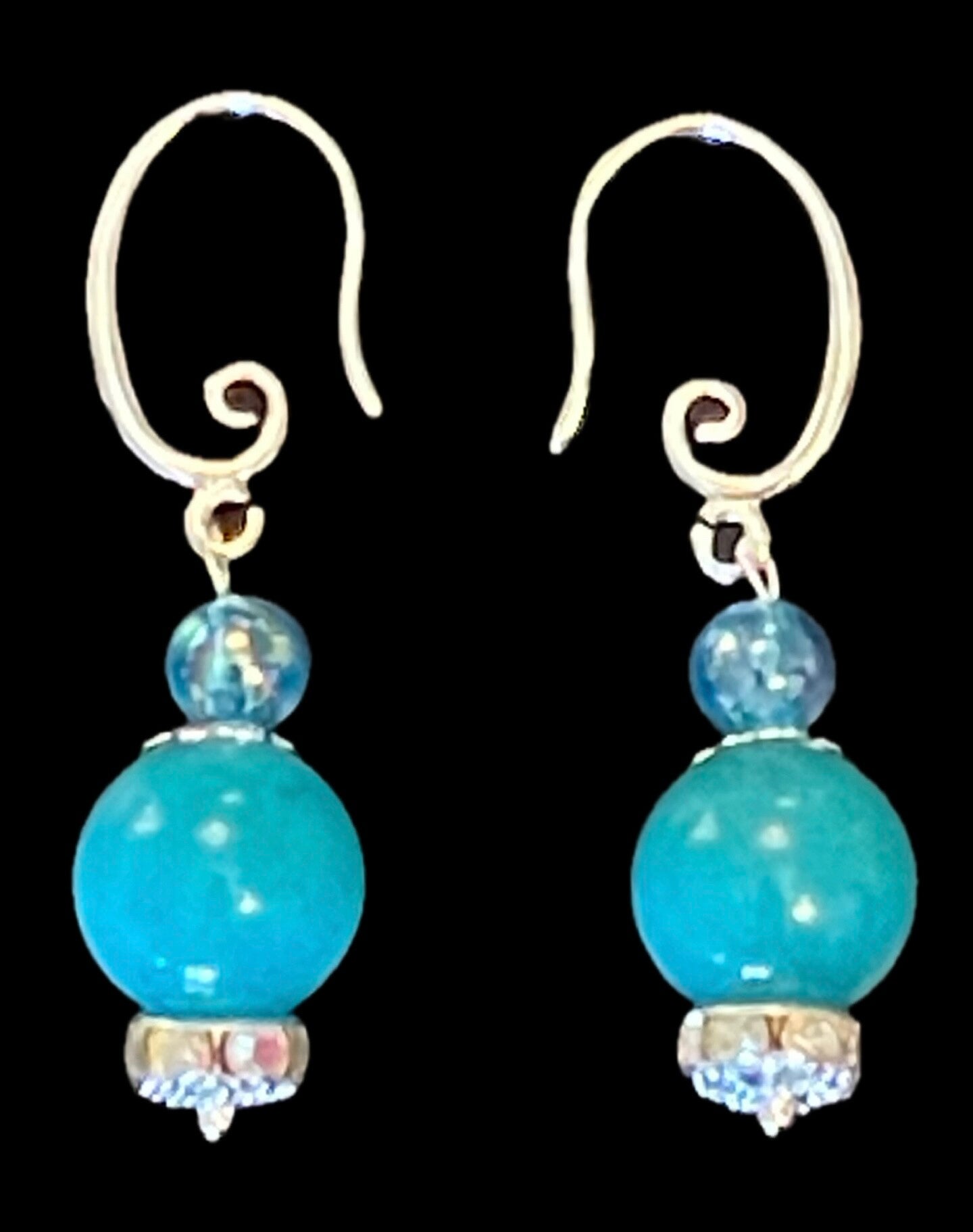 These earrings feature two types of beads.Prominent bead is a turquoise or blue-green color, with a smooth, polished finish. Positioned above the larger beads a lighter, translucent blue that have multiple facets, giving them a sparkling appearance