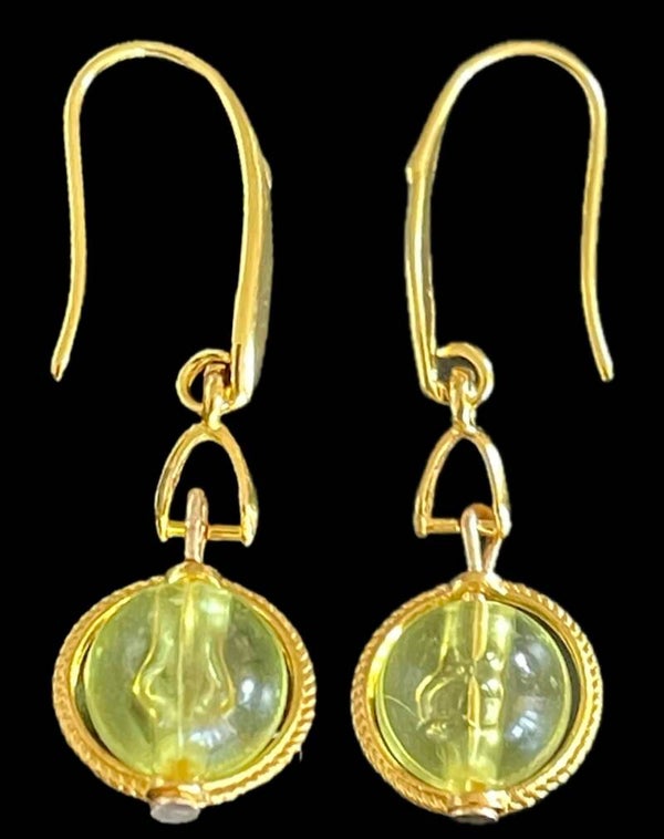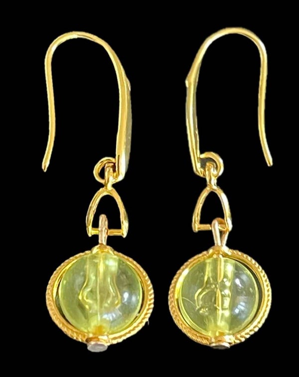 The earrings feature gold-colored findings made of iron, nickel free with shepherd hooks that are sterling silver coated in gold tone colour. The bead is a light yellow green, iridescent, sphere-shaped bead. Earrings measure 4 cm long