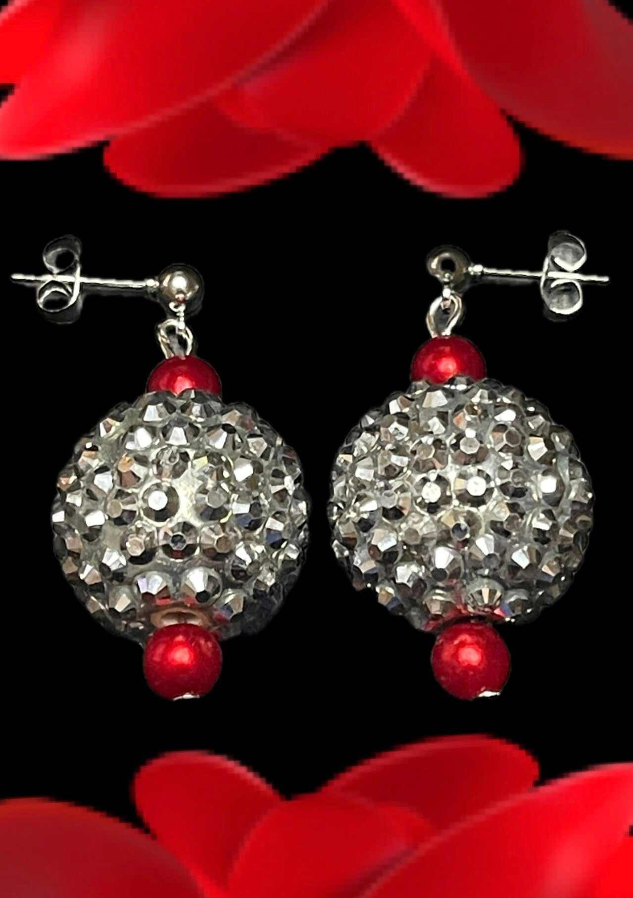 these earrings are a pair of sterling silver stud earrings with a dangling design. The earrings feature a post-back closure and a drop design composed of three main components: a small red bead, a large silver-toned pave crystal or rhinestone ball, and a second small red bead at the bottom. The large, round ball is covered in sparkling crystals, giving it a glittery, disco ball-like appearance. Earring measures 4cm long.