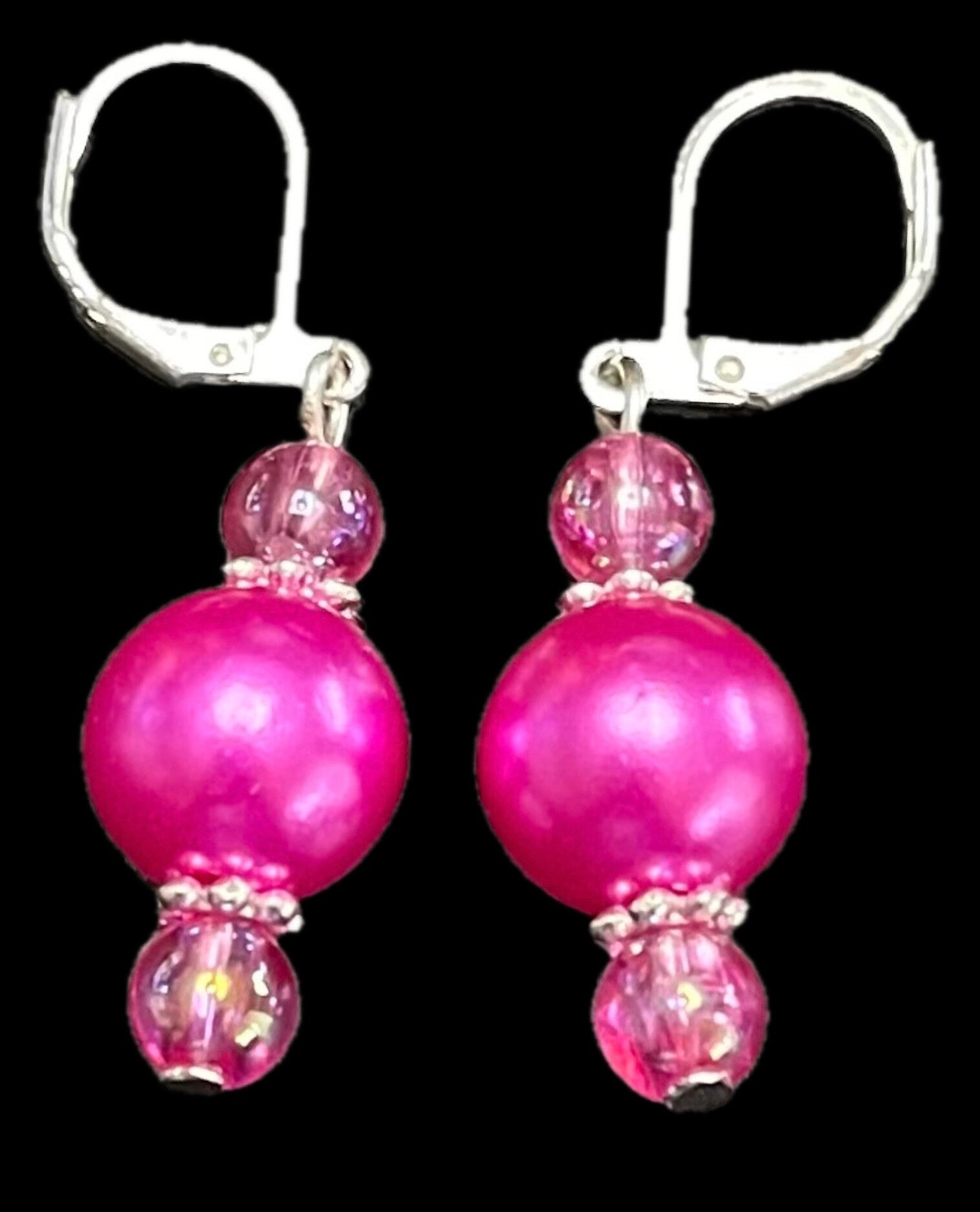 These dangle earrings feature sterling silver lever-back hooks and a drop design composed of three beads. A large, round, hot pink pearl-like bead in the middle, and small faceted, translucent pinkish-purple beads at the top and at the bottom of that larger bead. Tiny silver colored spacer beads used to separate the beads.Each earring measures 5cm long