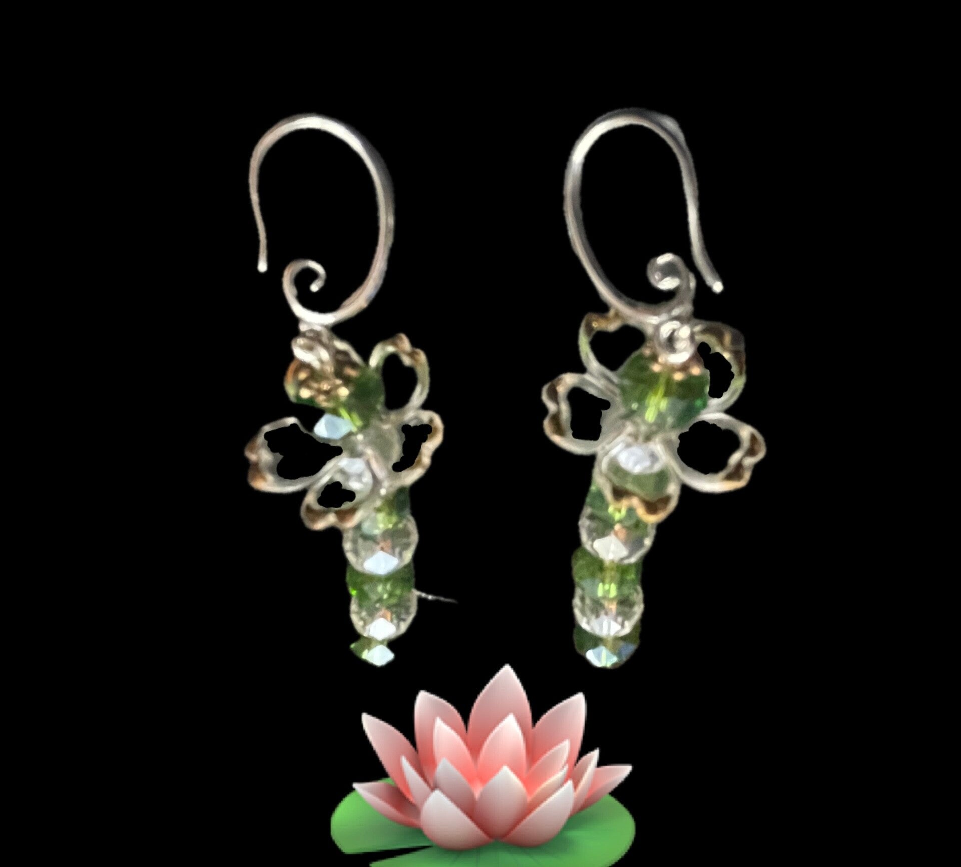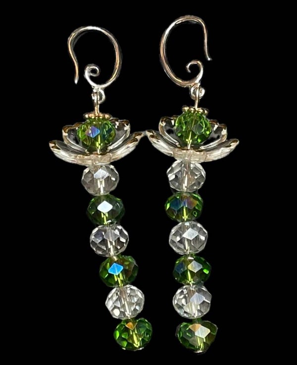 Lotus resilience and beauty dangle earrings feature faceted green and clear glass beads with sterling silver french hooks.