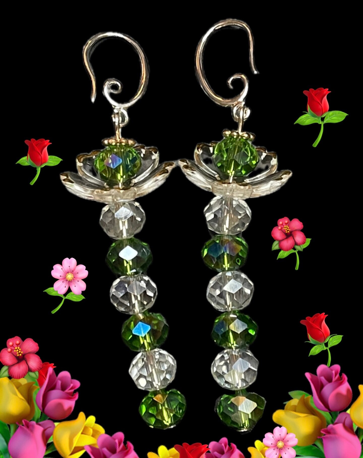 Le haut de chaque boucle d'oreille est orné d'un petit élément décoratif argenté, juste en dessous du crochet, surmonté d'une petite perle de verre verte nichée dans un support en forme de pétale, évoquant une fleur ou un lotus. Longueur : 7 cm.