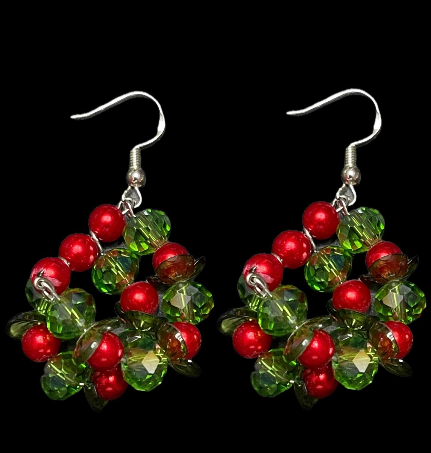 Celebrate the spirit of the holidays with these Christmas-themed dangle earrings, designed to resemble a small wreath. A mix of opaque red, round beads and translucent, faceted green glass beads. Earrings attached to sterling silver fishhook earring findings. Earrings measure 6cm long.