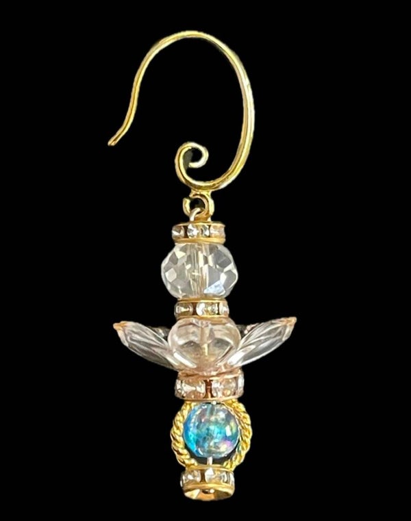 A thoughtful way to commemorate loved ones who have passed away. The design is believed to offer a sense of protection and guidance. The earrings have an elegant, sparkling appearance, suitable for holiday wear or year-round. These handmade dangle earrings designed to look like angels. Suspended from gold-tone sterling silver French-style ear wires. A clear, faceted crystal bead forms the "head". A clear flower pedal bead form the “wings.” A round, iridescent blue/teal bead forms the "body" or "skirt", set within gold-tone components, including a twisted rope-like band. Earrings measure 6cm long