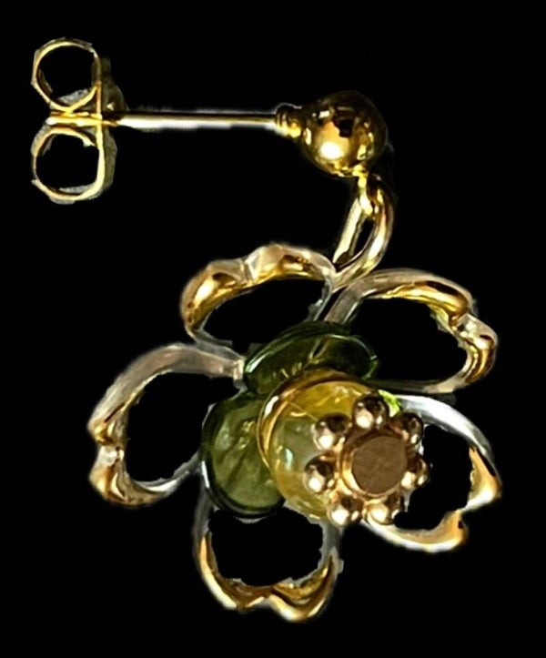 A multi-petal floral design. The petals are a mix of translucent dark green and clear material. The center of the flower is adorned with vtwo round beads or gemstones: one is a translucent green, and the other is a lighter yellow. It is a stud earring with a standard post and butterfly clutch backing. Earrings measure 3cm long.