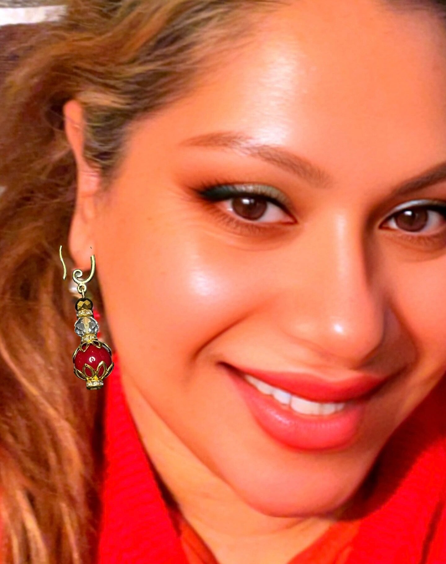 Earring hooks are made of 925 sterling silver with gold-tone. The rich, deep red of the main bead is reminiscent of classic Christmas baubles or bright holly berries, while the sparkling clear crystal and gold-toned settings add the dazzling shimmer of holiday lights and tinsel. The ornate metalwork could be seen as a stylized festive crown or a decorative ornament cap, making them a perfect accessory for a holiday party or a festive gathering. Earrings measure 5cm long.