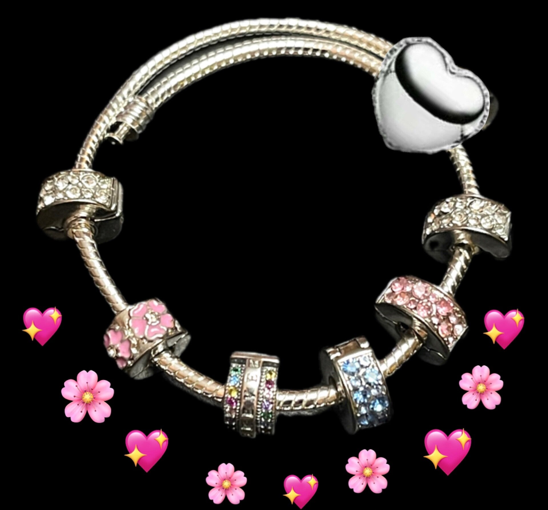 S925 sterling silver size ; 19cm (7.48 inches) charm bracelet with a rounded snake chain design and a heart-shaped clasp. The bracelet is adorned with several distinct charms and beads.