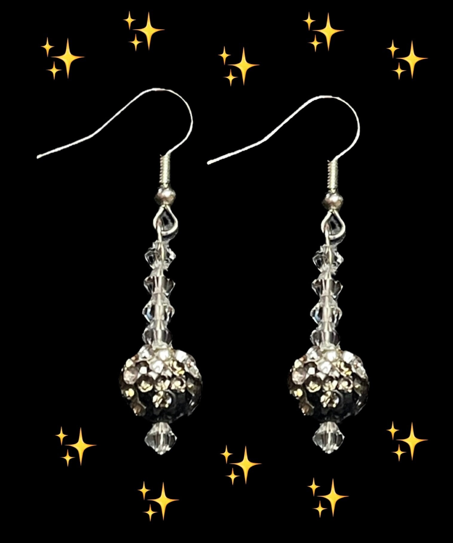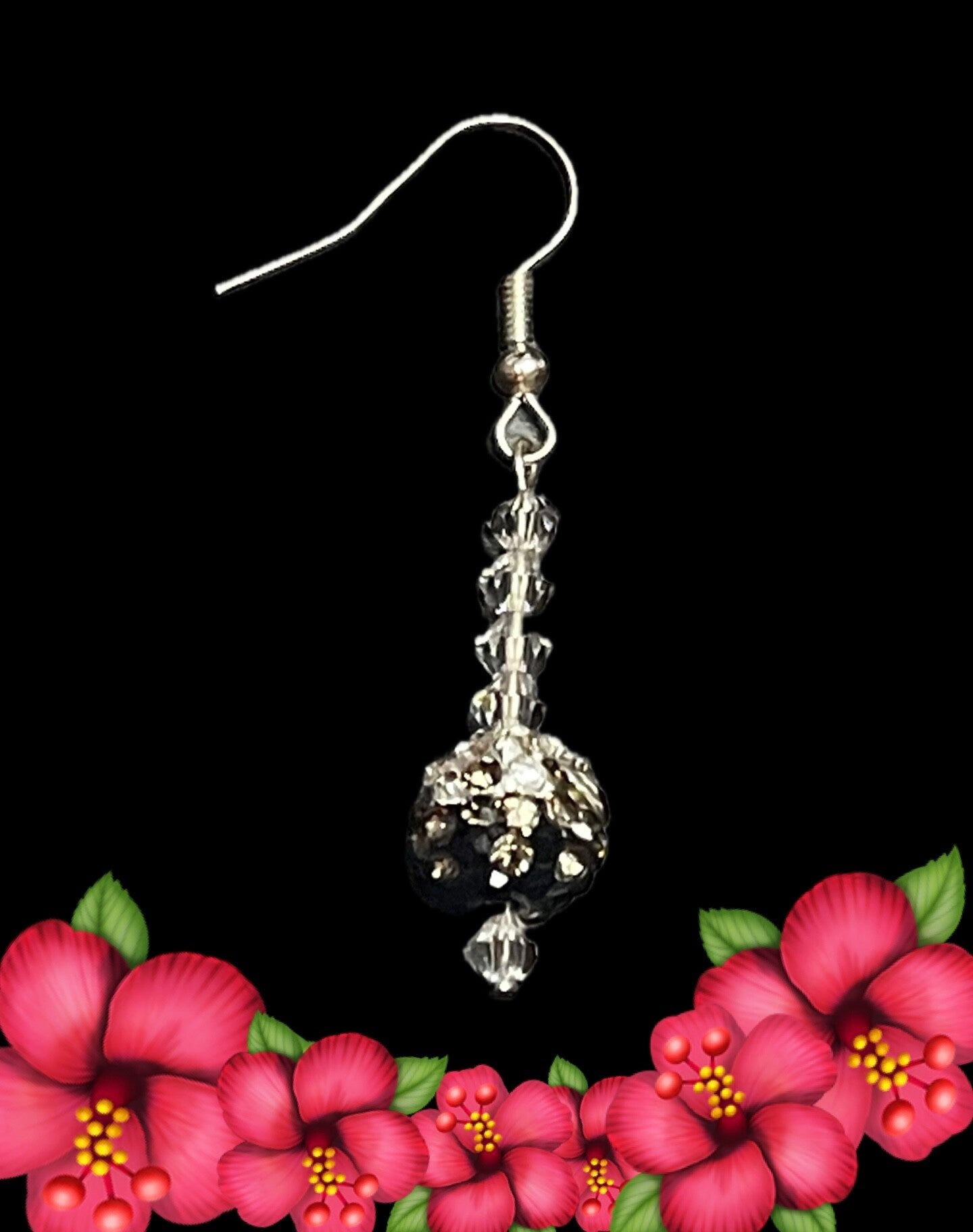 A large, 10mm round pavé charcoal silver rhinestone bead encrusted with numerous small crystals sits below the bicone stack. A single, smaller bicone crystal bead hangs as a drop at the very bottom.Ear wire is French hook earring wires in 925 sterling silver. Earrings measure 5 cm long.