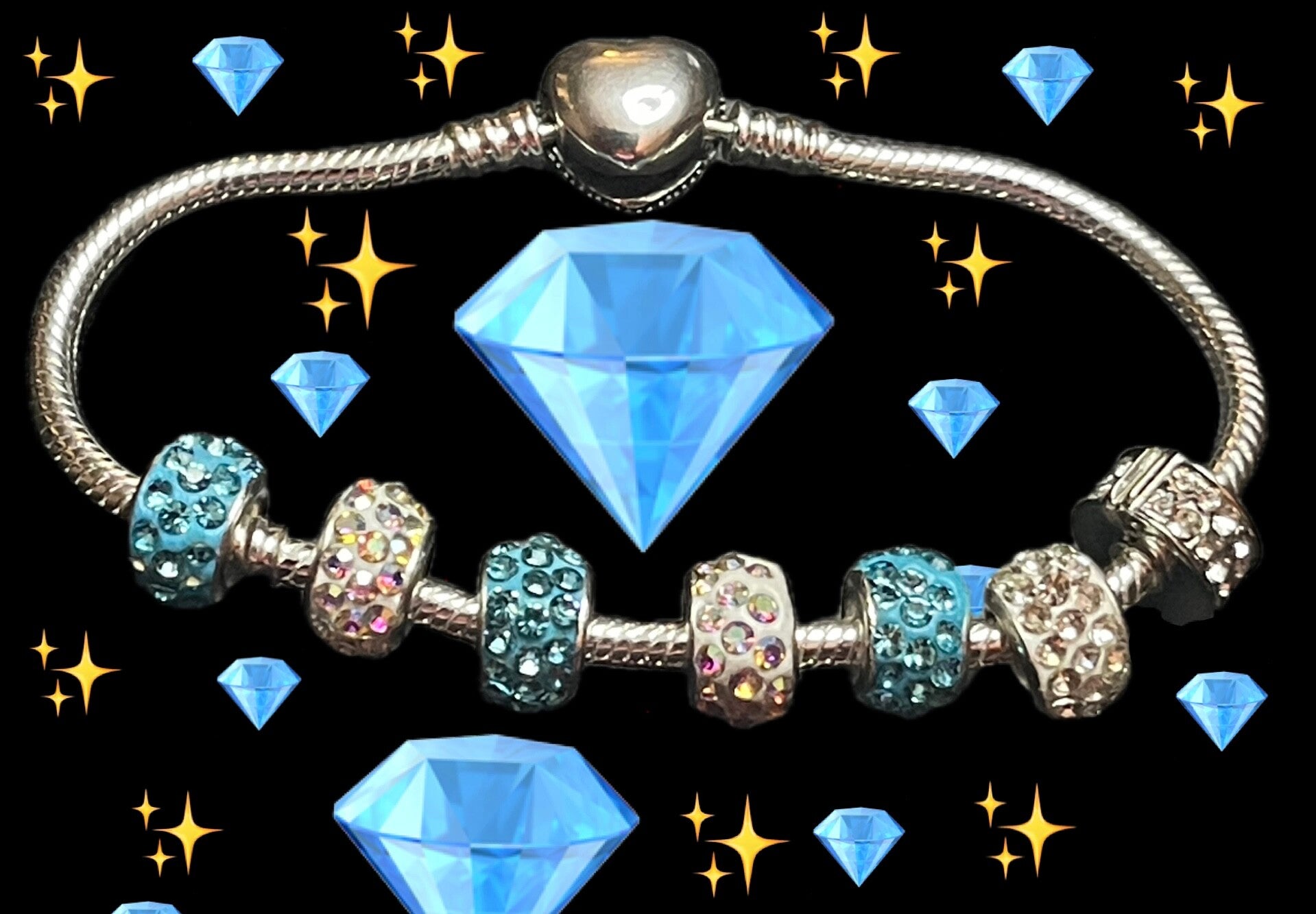 Beautiful snake chain bracelet in 925 sterling silver secured by a heart shaped clasp. The bracelet features several alloy bead charms. 3 of them silver tone colour encrusted with light blue/teal crystals and 3 white charms ,2 encrusted with ab crystals and one silver clip charm. Bracelet measures 19cm long.